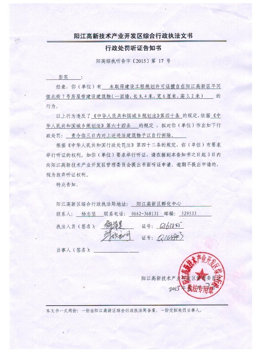 行政處罰聽(tīng)證告知書(shū)(陽(yáng)高綜執(zhí)聽(tīng)告字〔2015〕第 17 號(hào))