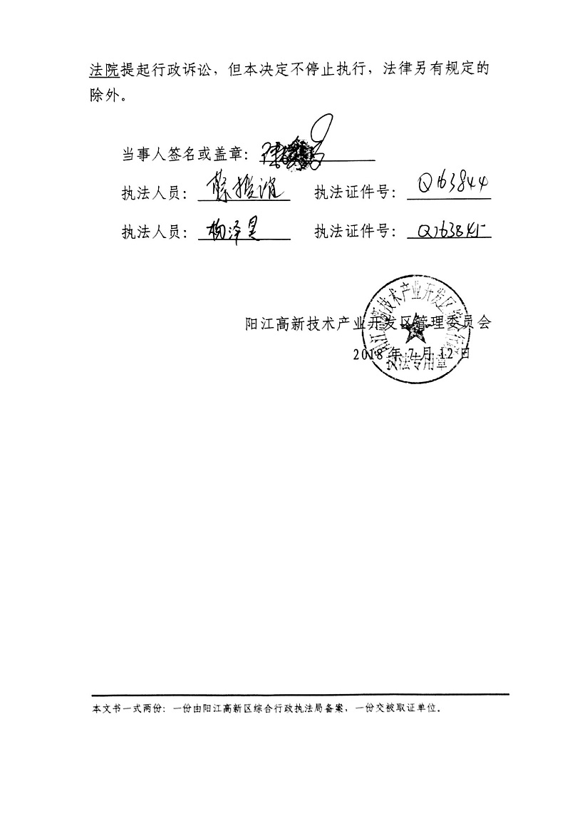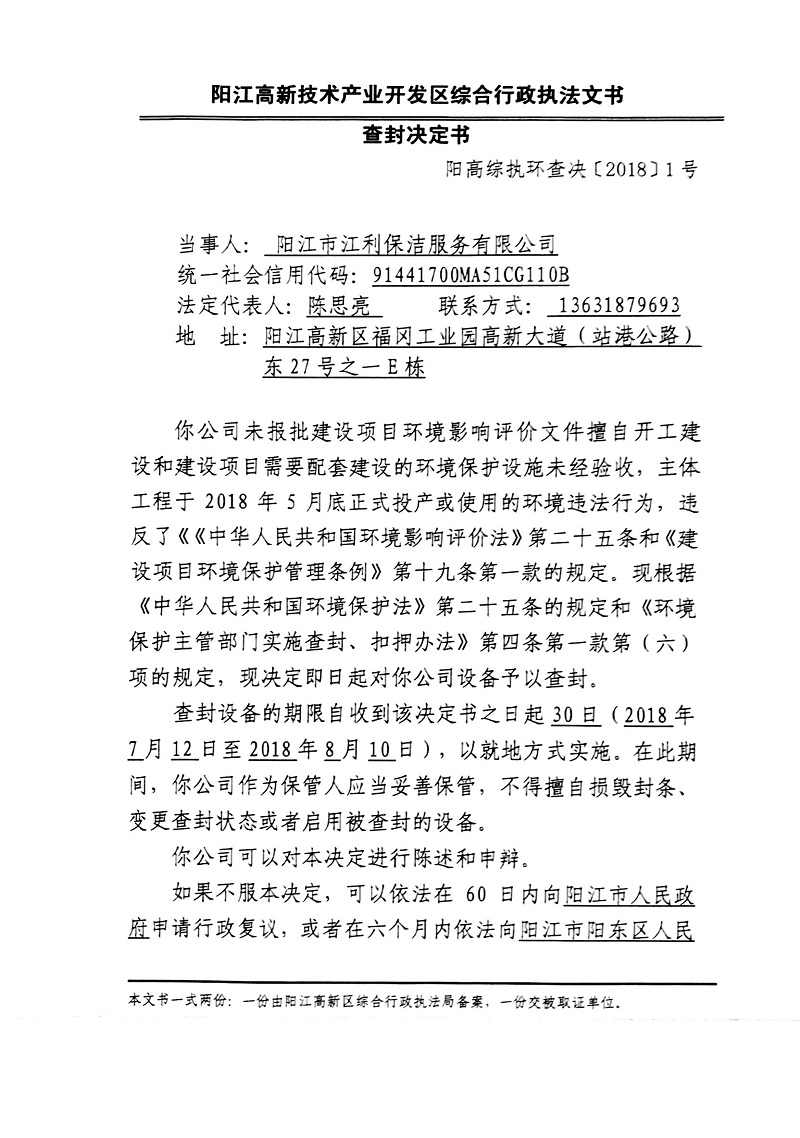 陽江高新技術(shù)產(chǎn)業(yè)開發(fā)區(qū)綜合行政執(zhí)法文書查封決定書(陽高綜執(zhí)環(huán)查決〔2018〕1號)