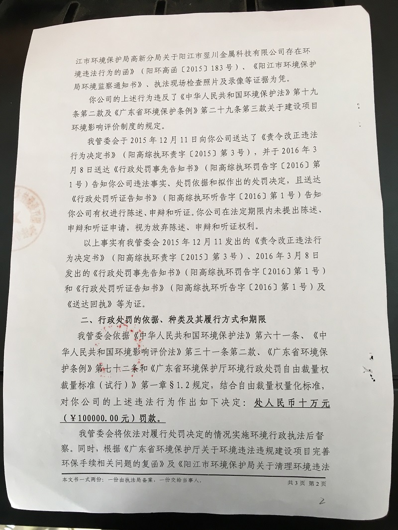 依據(jù)《中華人民共和國環(huán)境保護(hù)法》第六十一條、《中華人民共和國環(huán)境影響評價法》第三十一條第二款、《廣東省環(huán)境保護(hù)條例》第七十二條的規(guī)定,處人民幣十萬元(¥100000.00元)罰款。 |